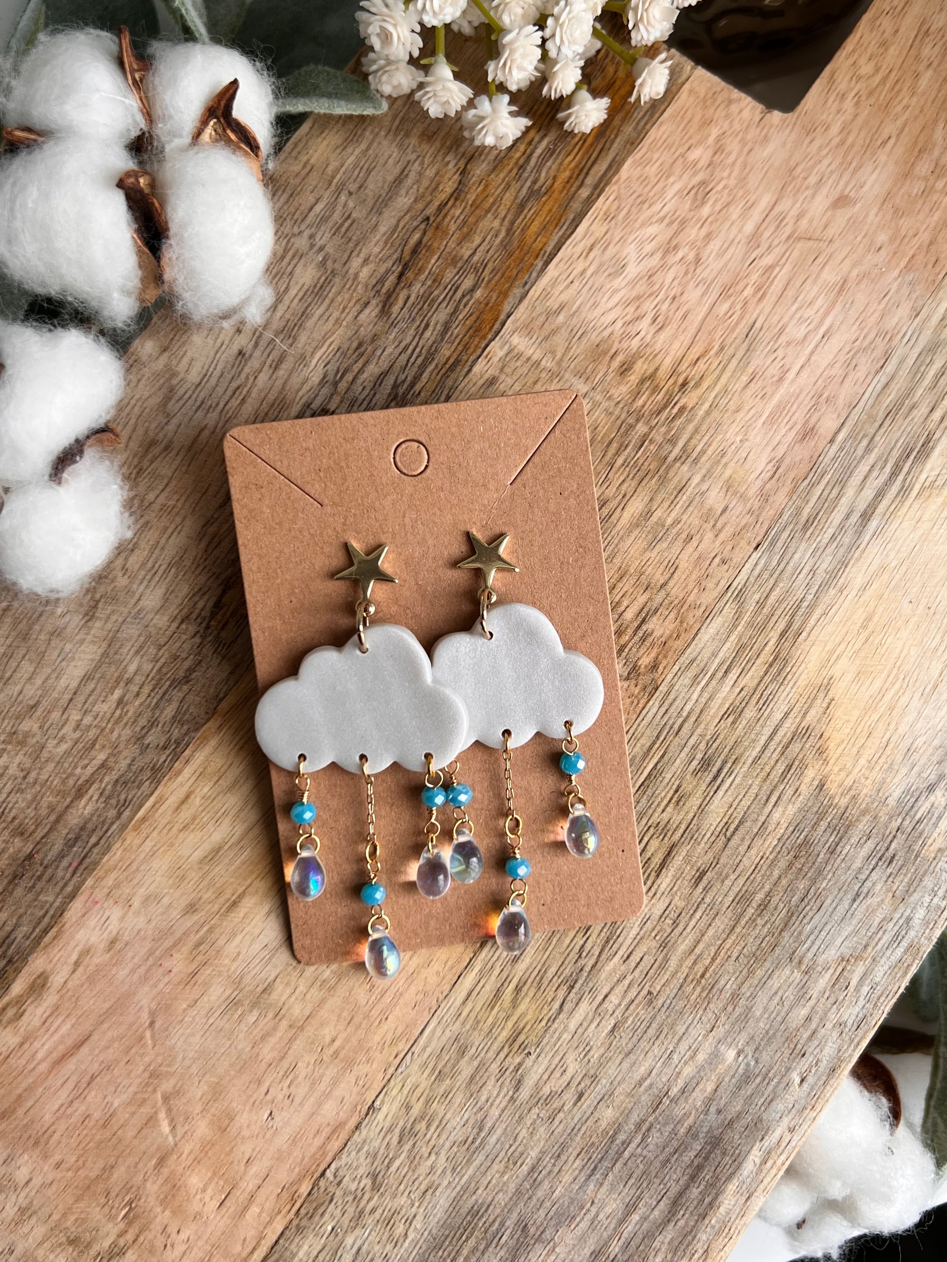 These shimmery clouds are adorned with multicolor raindrops on a gold star post. Perfect for a rainy day or to wear all year long 🌧️