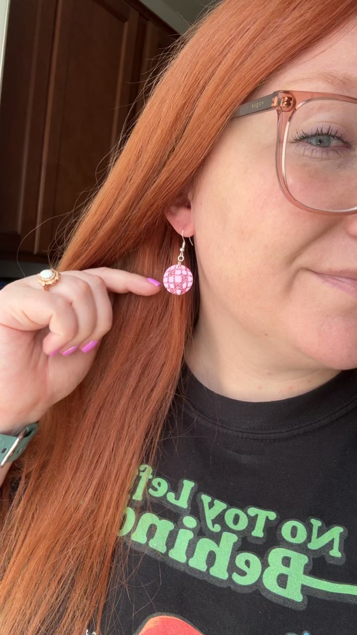 Pink clay disco balls with pink glitter topped with resin on fishhooks!