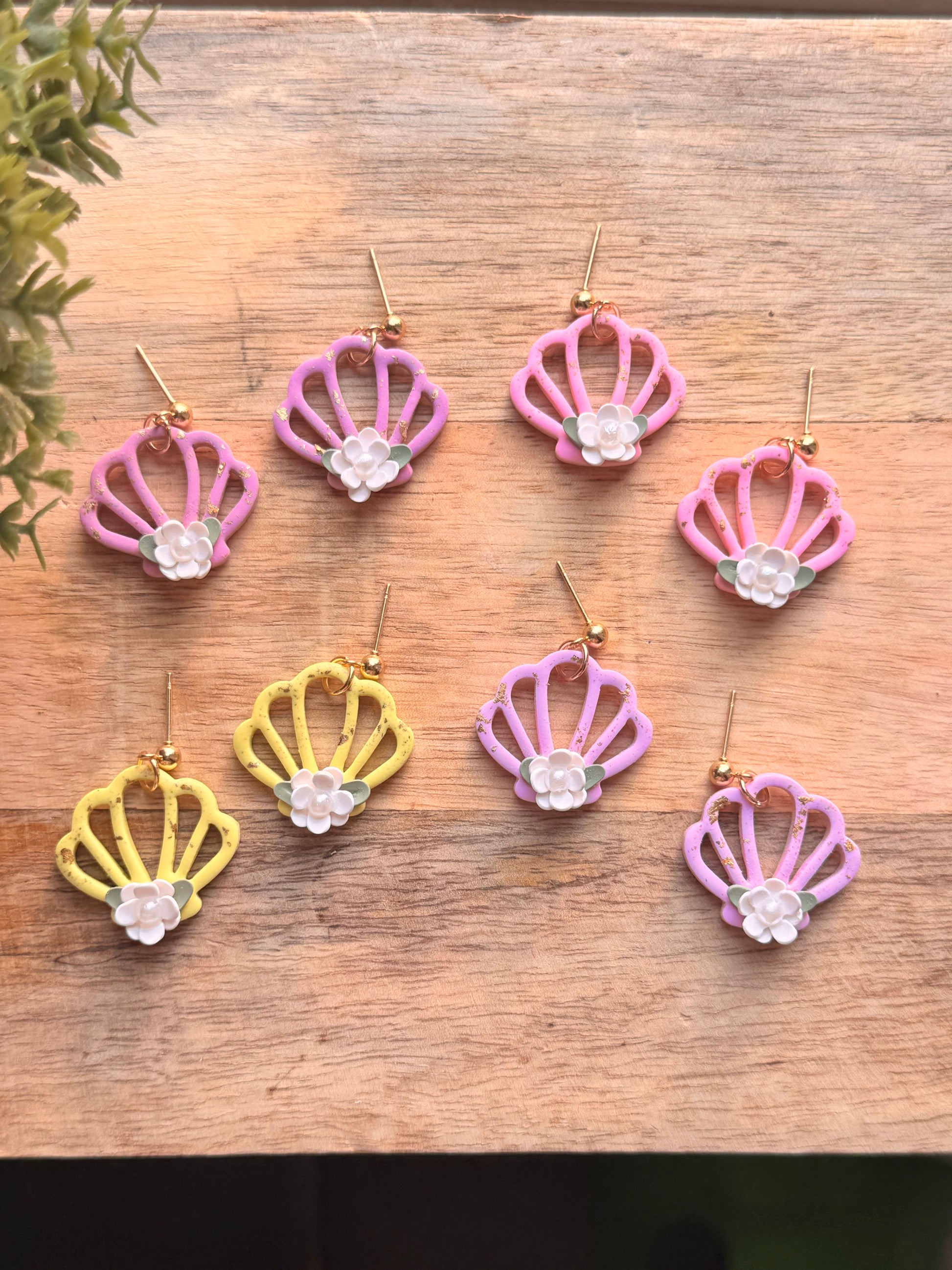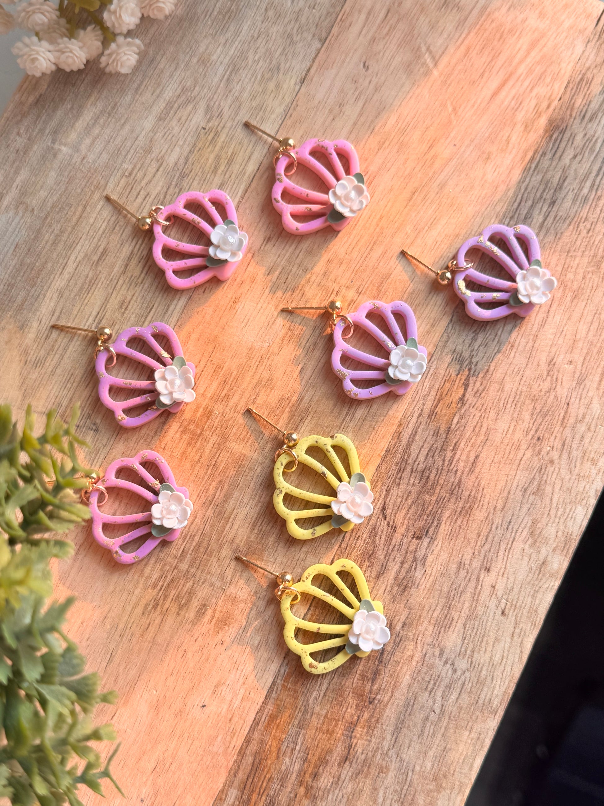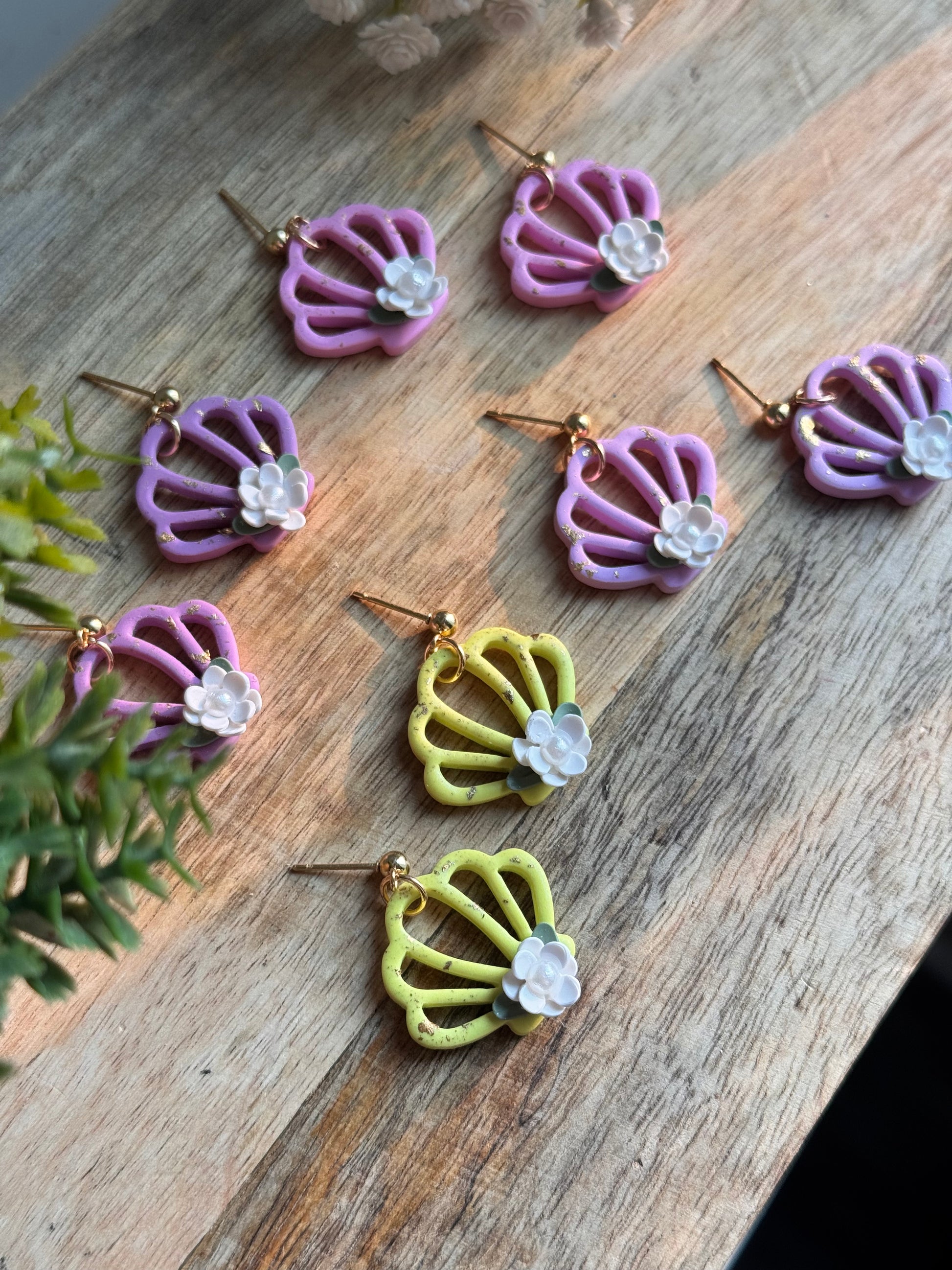 These whimsical seashell-inspired earrings blend the charm of a summer garden with coastal vibes. Handcrafted from lightweight polymer clay, each pair features an open shell design adorned with a delicate 3D white flower and soft green leaves for a dreamy, feminine touch. Speckled with subtle gold flakes, they shimmer just enough to catch the sunlight. 🐚✨