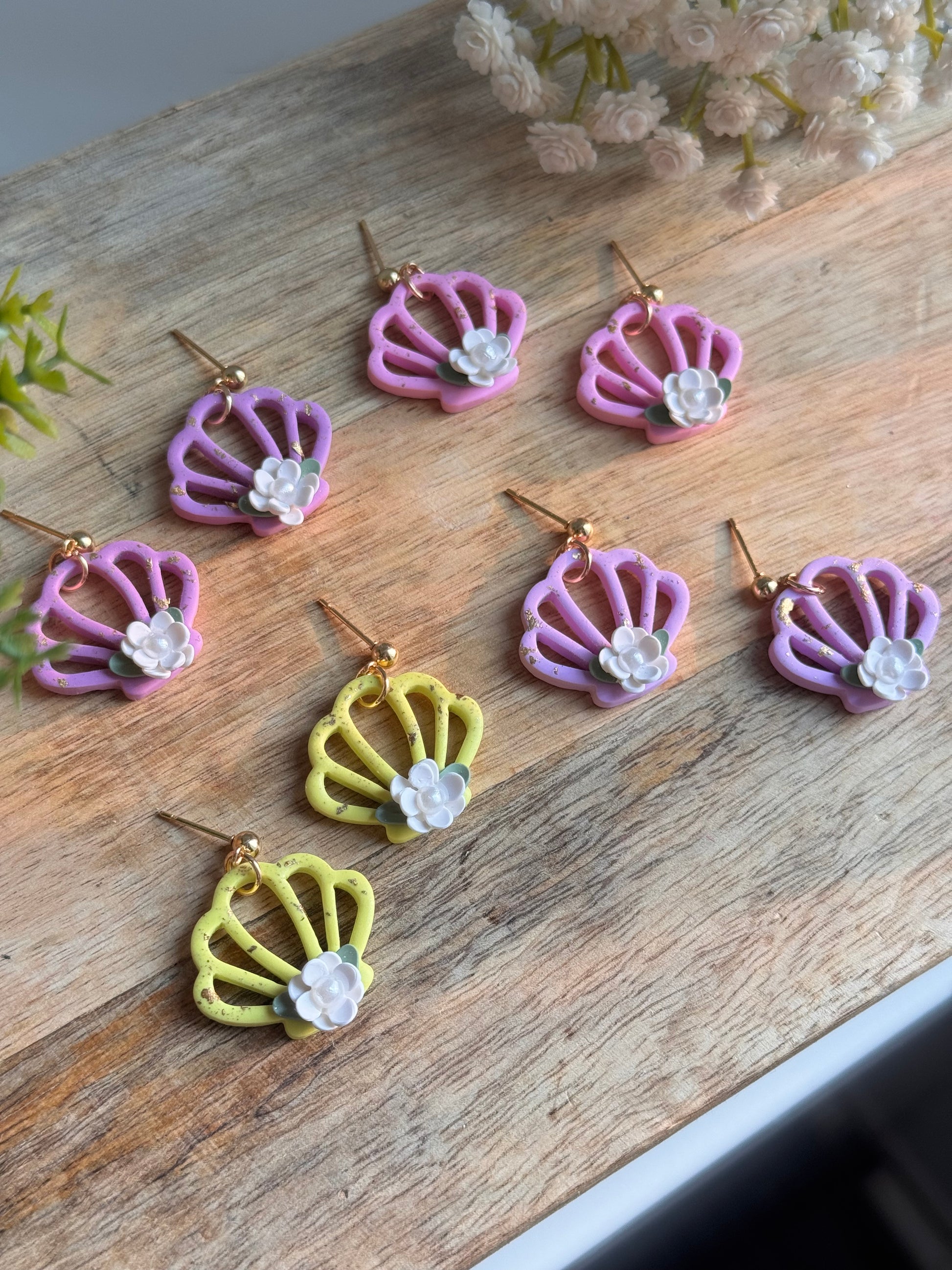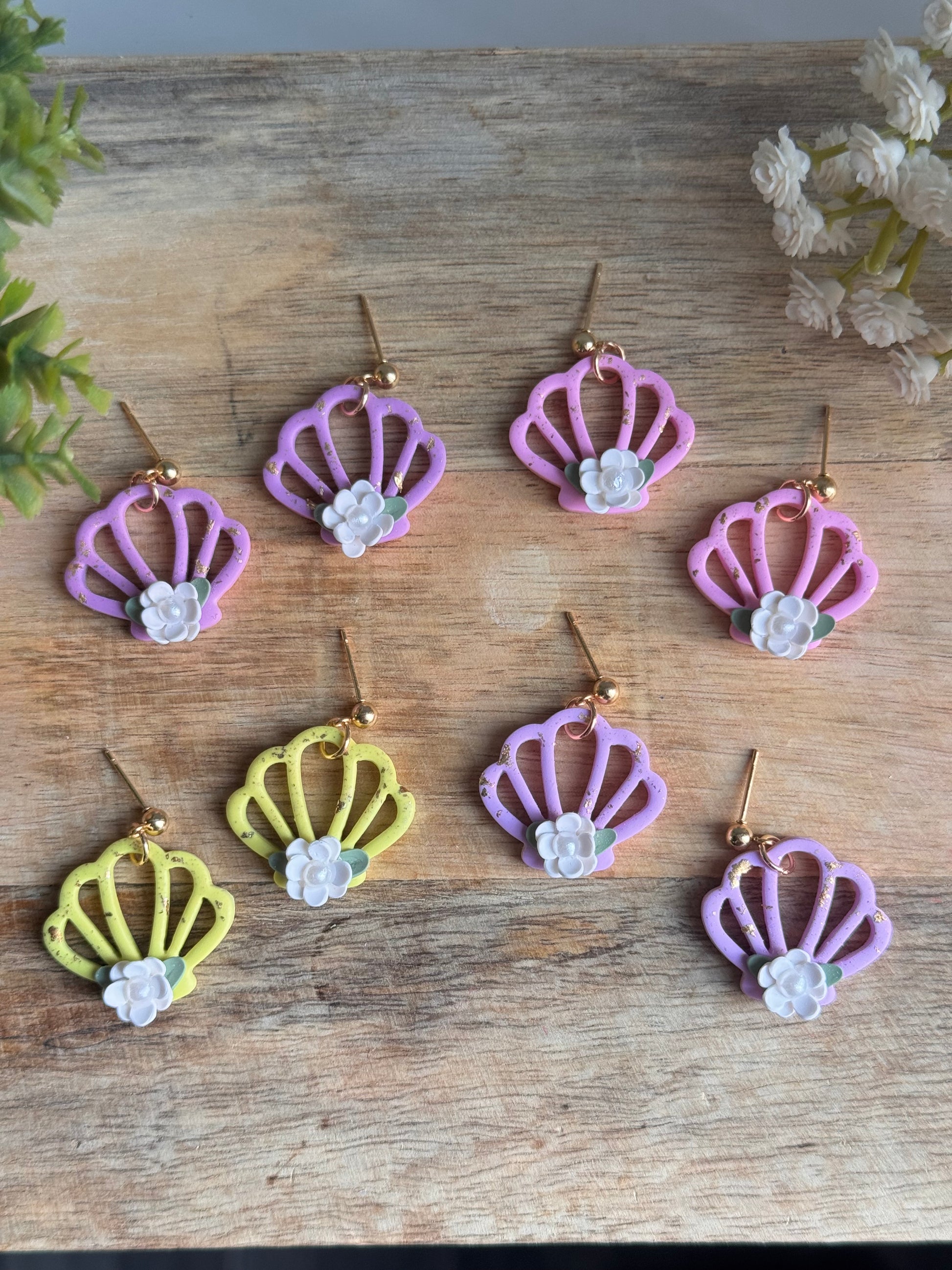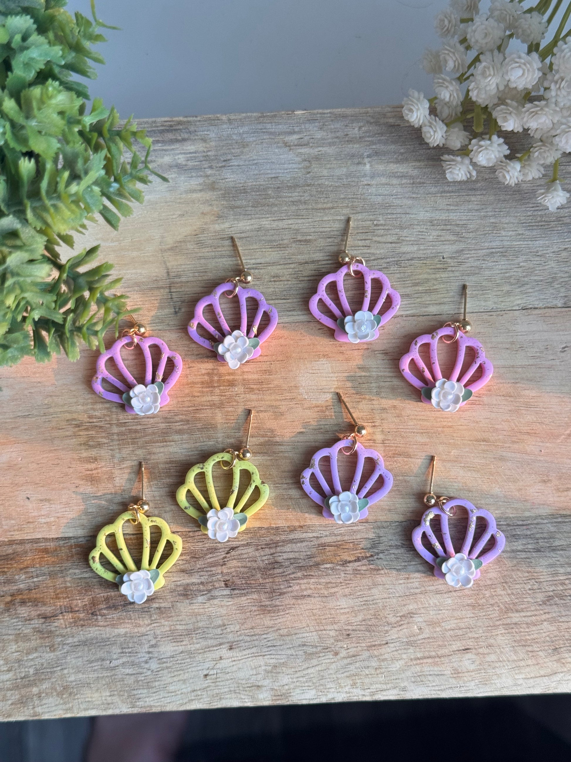 These whimsical seashell-inspired earrings blend the charm of a summer garden with coastal vibes. Handcrafted from lightweight polymer clay, each pair features an open shell design adorned with a delicate 3D white flower and soft green leaves for a dreamy, feminine touch. Speckled with subtle gold flakes, they shimmer just enough to catch the sunlight. 🐚✨