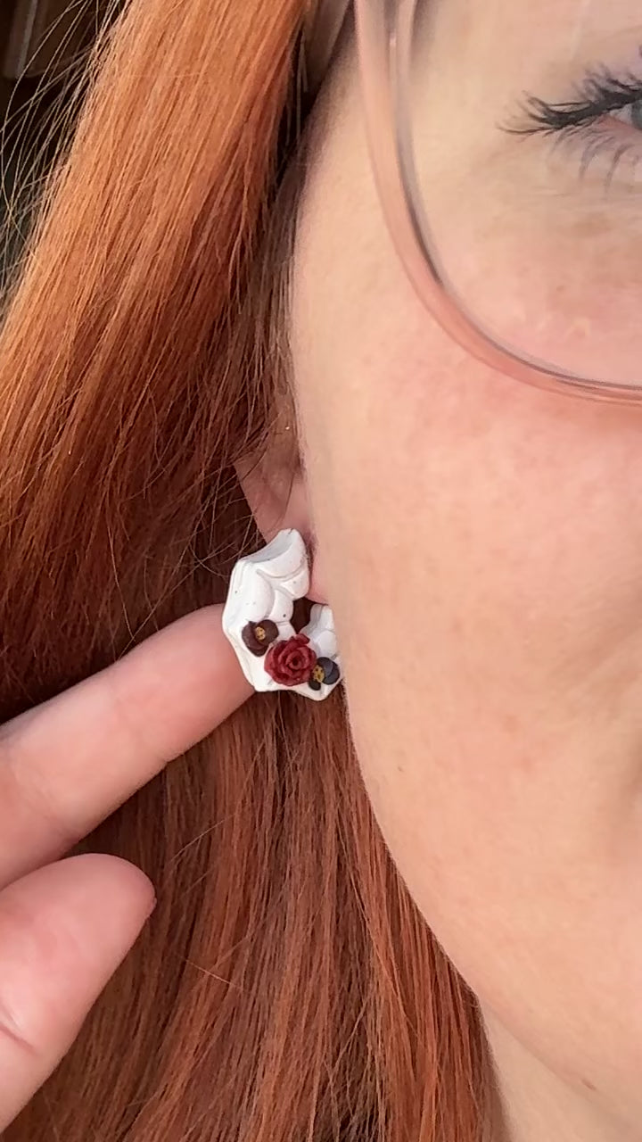 Large White speckled clay spiderweb hoops with hauntingly beautiful florals!