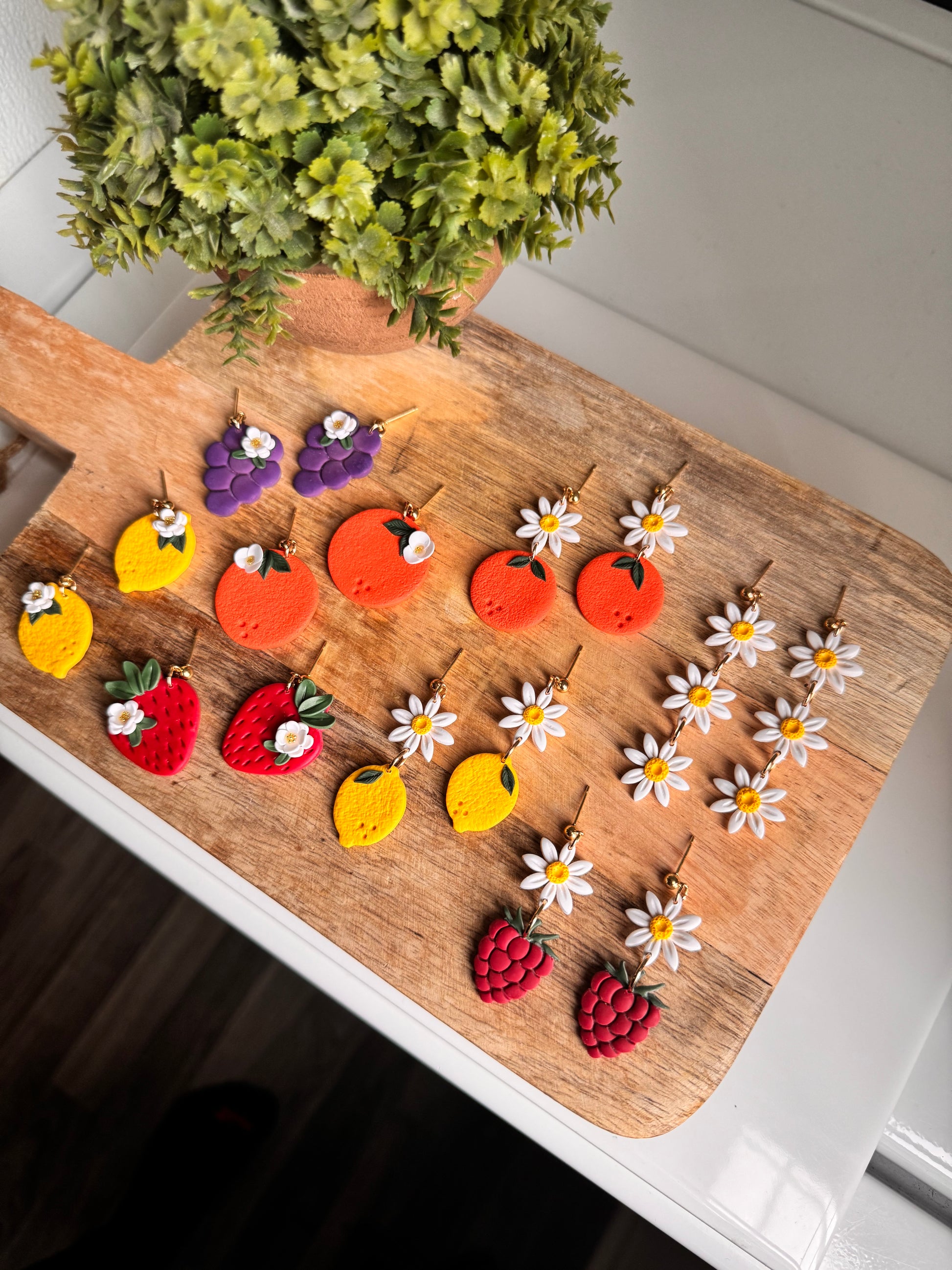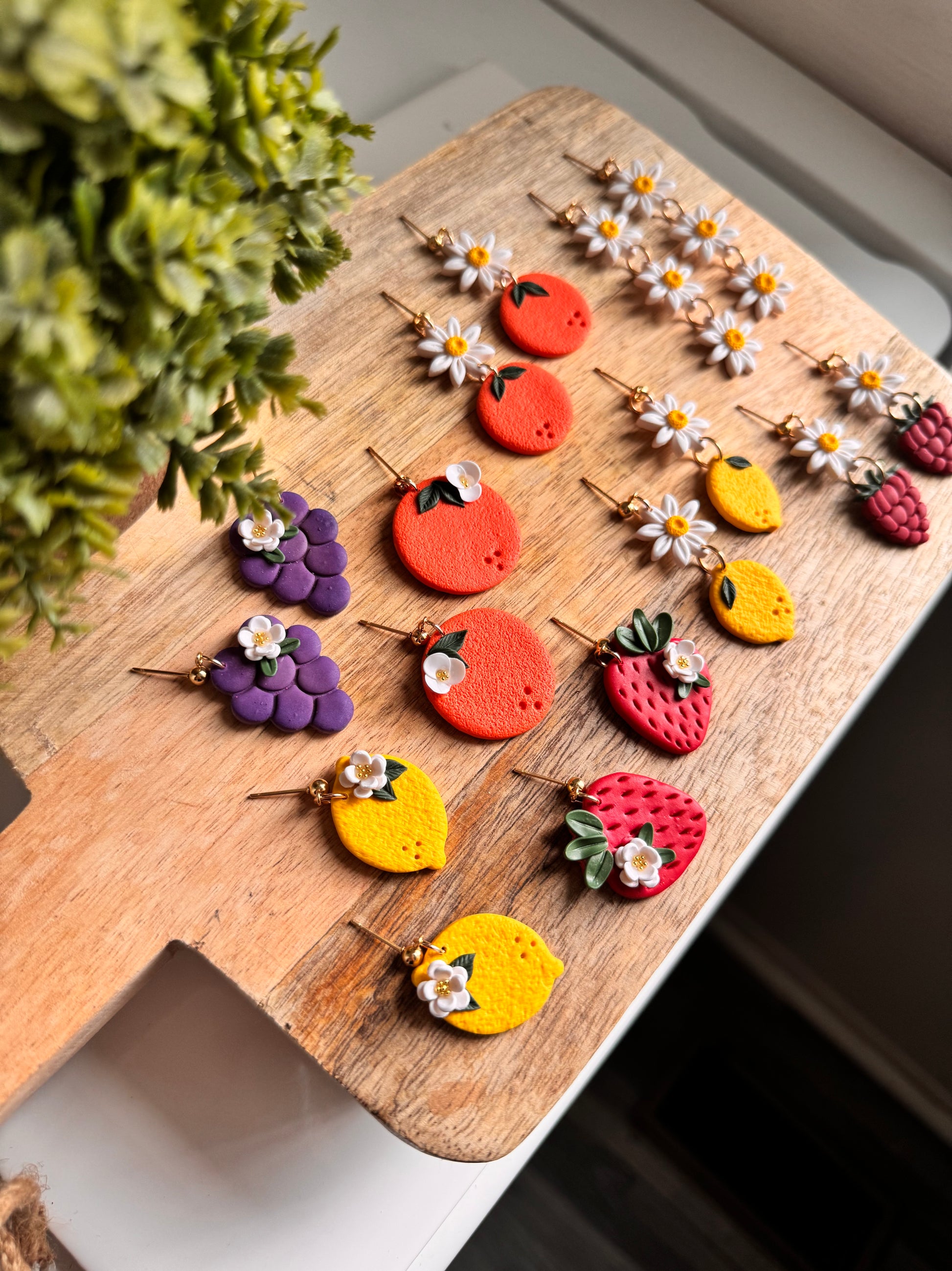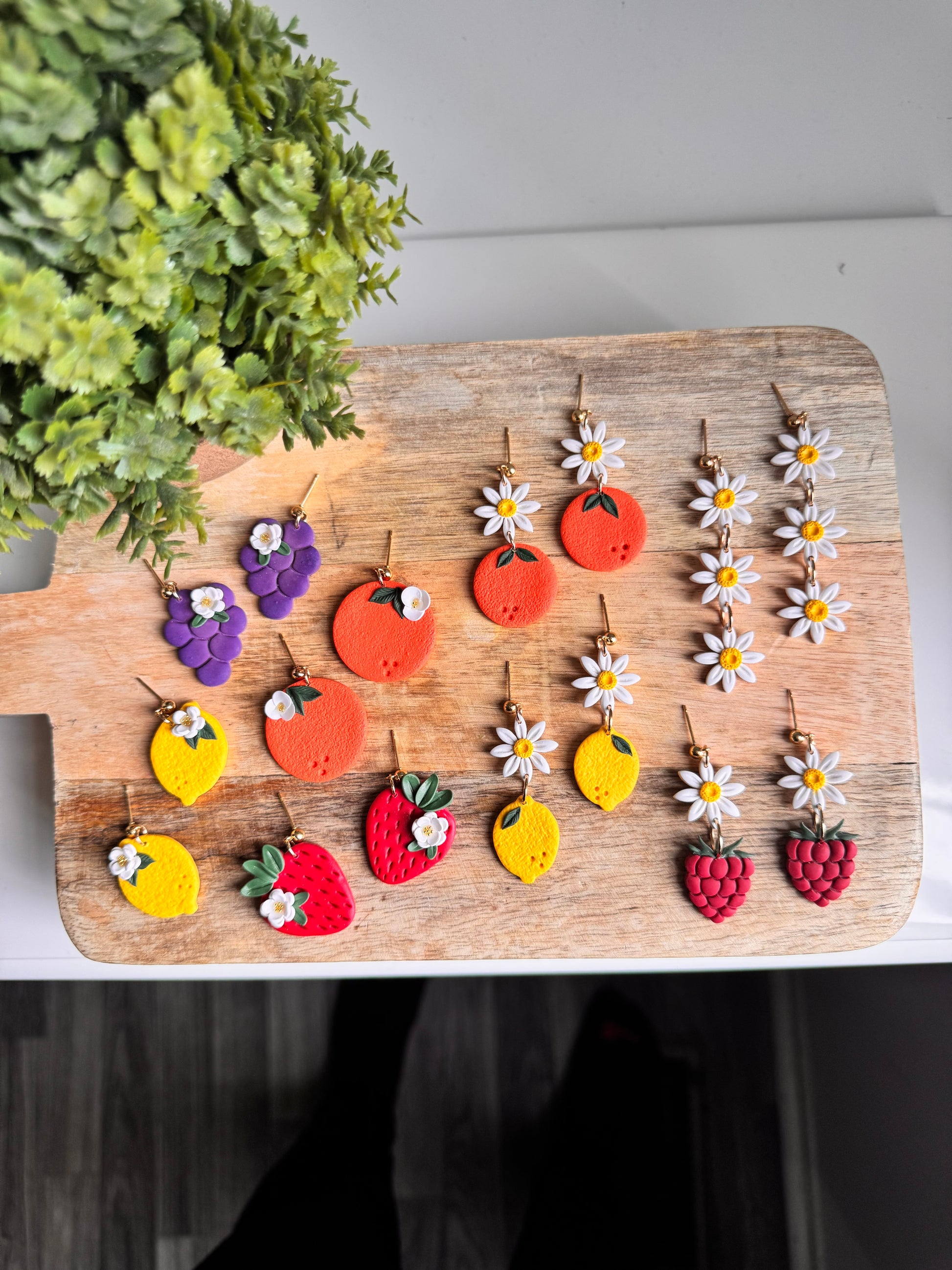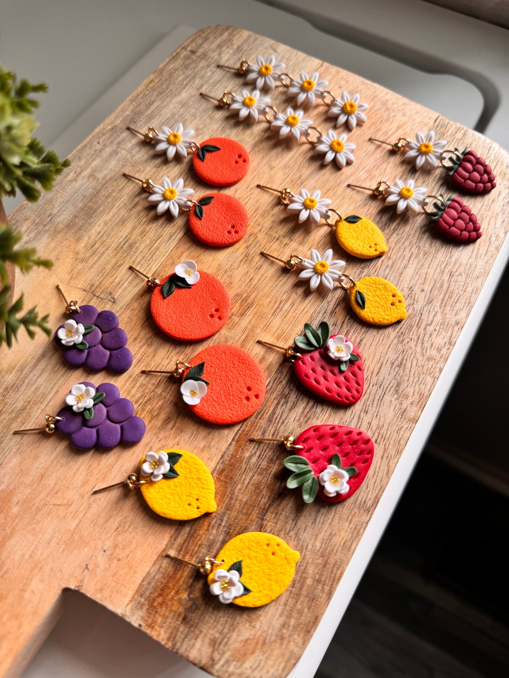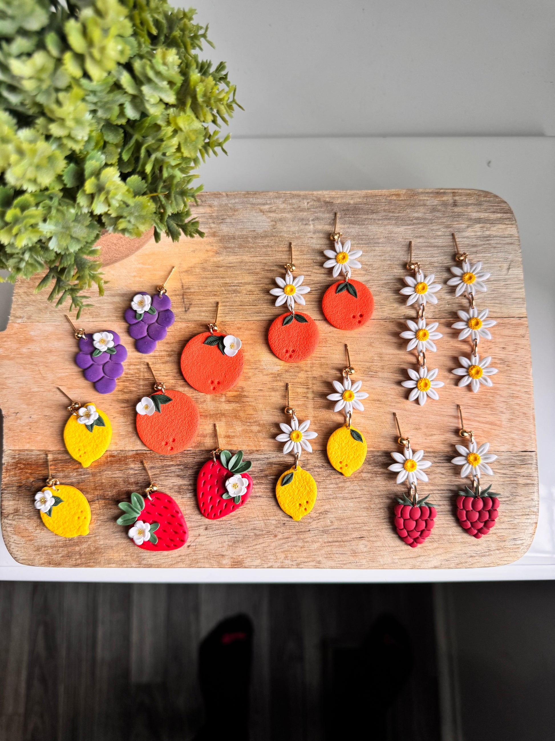 Fresh-picked charm meets handmade artistry in the Fruit & Bloom Collection — a delightful range of polymer clay earrings inspired by nature’s sweetest offerings. Each pair is lovingly crafted with intricate details, capturing the essence of ripe fruit and cheerful daisies for a whimsical summer statement.