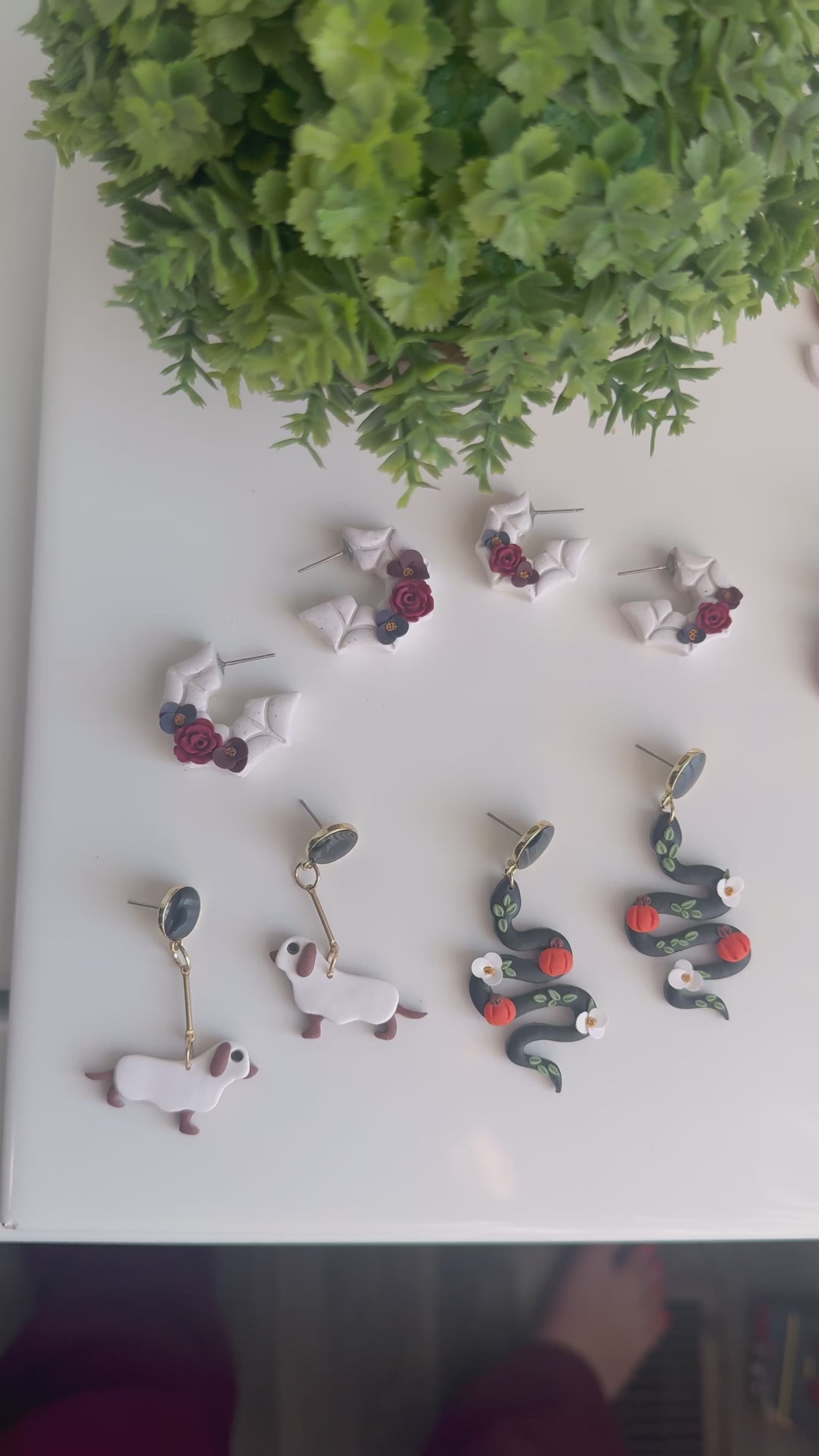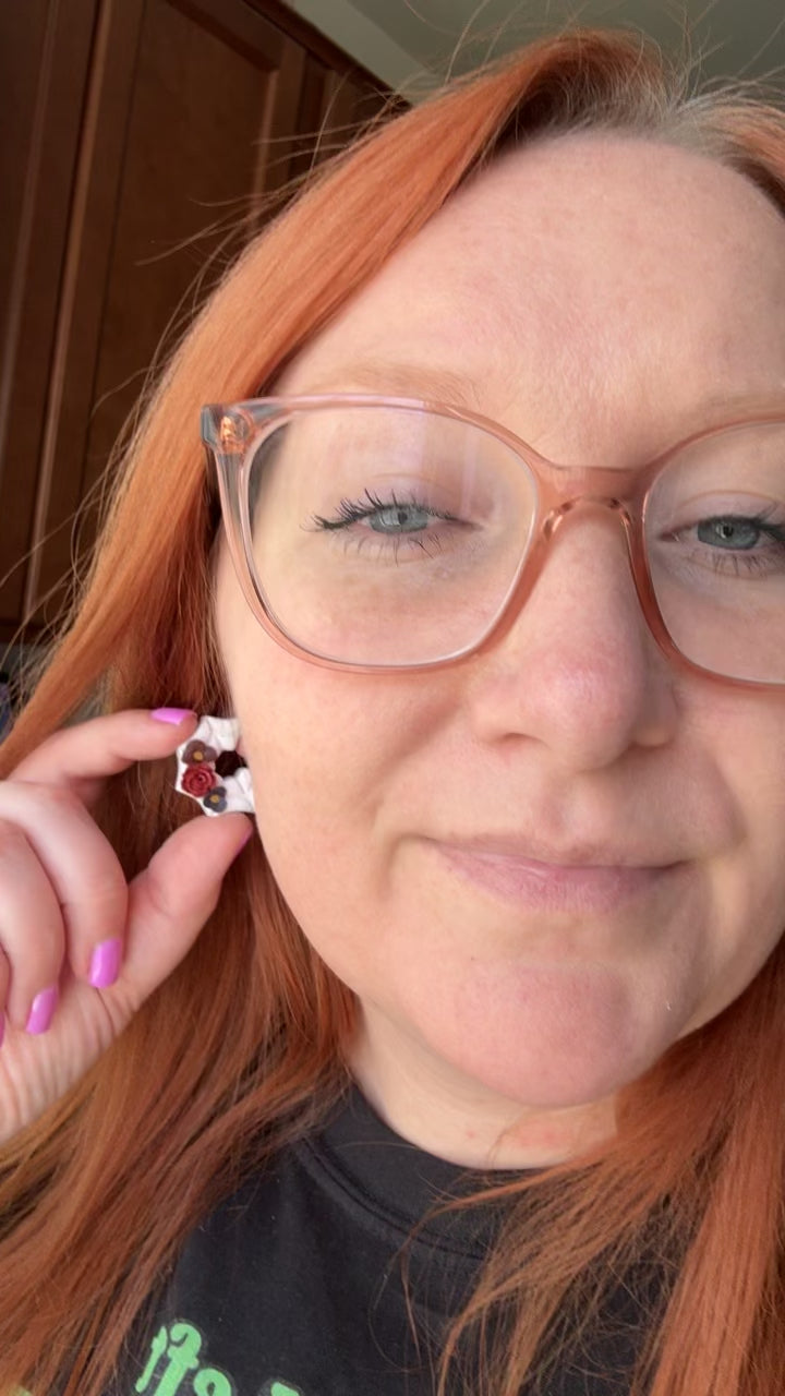 White speckled clay spiderweb hoops with hauntingly beautiful florals 🕷️🕸️