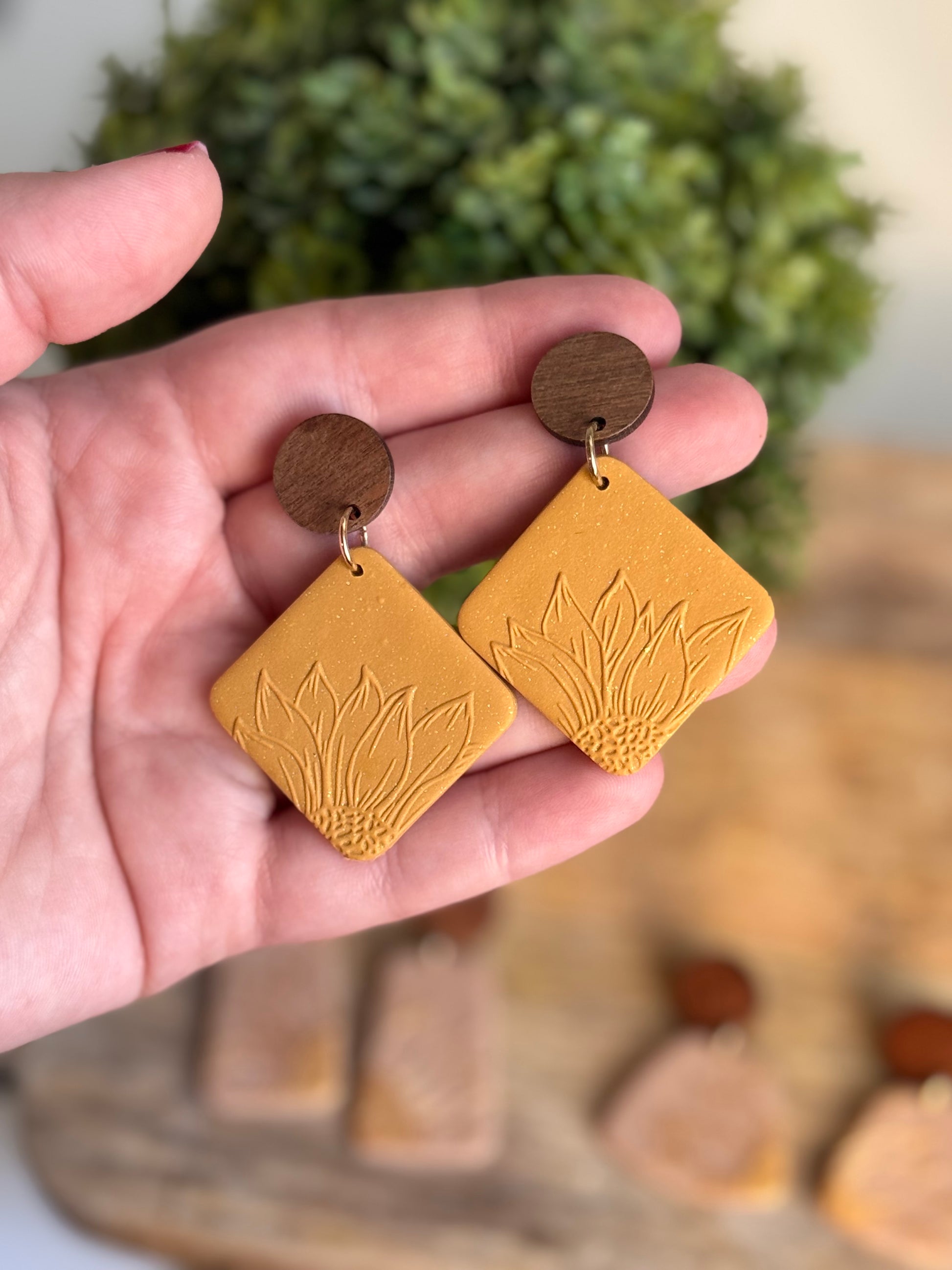 Sunflower embossed florals on mustard yellow diamond shaped clay with wooden circle posts
