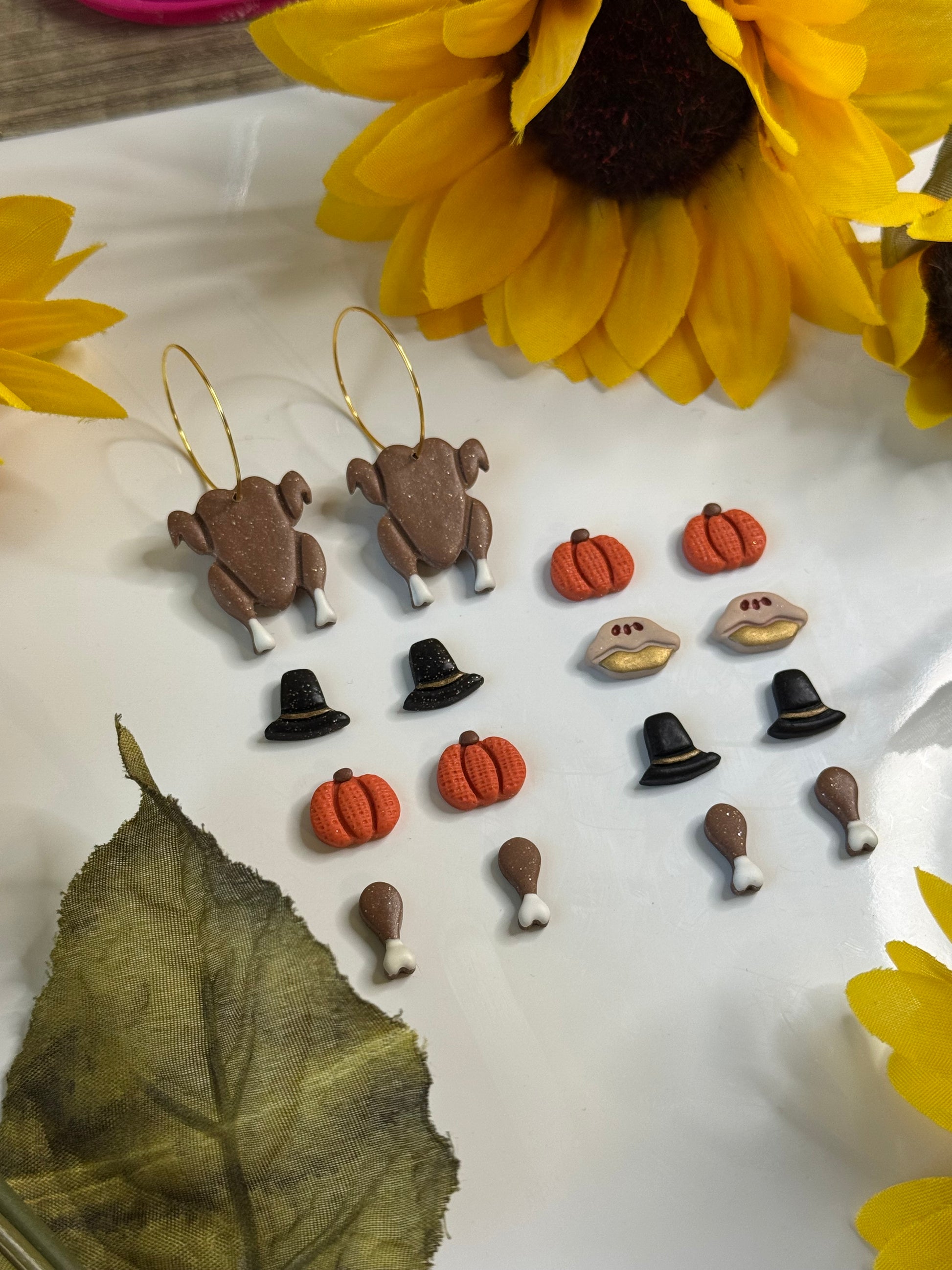 💛 Available as studs too! All stud designs (pumpkin, pie, hat, drumstick) can be turned into charm earrings — just choose gold or silver huggie hoops for a dangle option.
